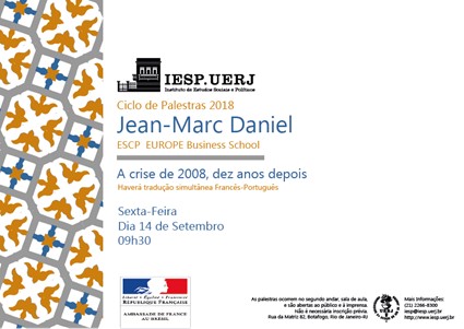 No próximo dia 14/09 ocorrerá o evento “A crise de 2008, dez anos depois”, em parceria com a Embaixada da França no Brasil, como parte do Ciclo de Palestras do IESP-UERJ. O evento contará com presença do professor Jean-Marc Daniel (ESCP – EUROPE Business School), às 09h30, na sala de aula do Iesp-Uerj.