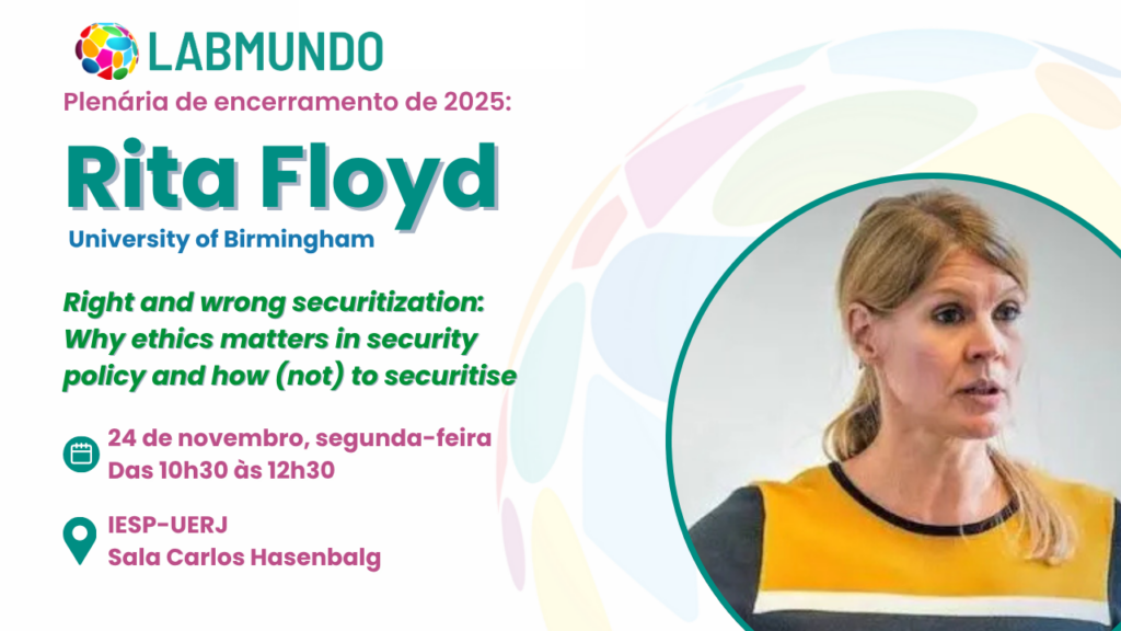 No dia 24 de novembro, o Laboratório tem o orgulho de convidar a Prof. Rita Floyd (University of Birmingham) para ministrar a palestra "Right and wrong securitization: Why ethics matters in security policy and how (not) to securitise" em nossa plenária de encerramento do ano, no IESP-UERJ.