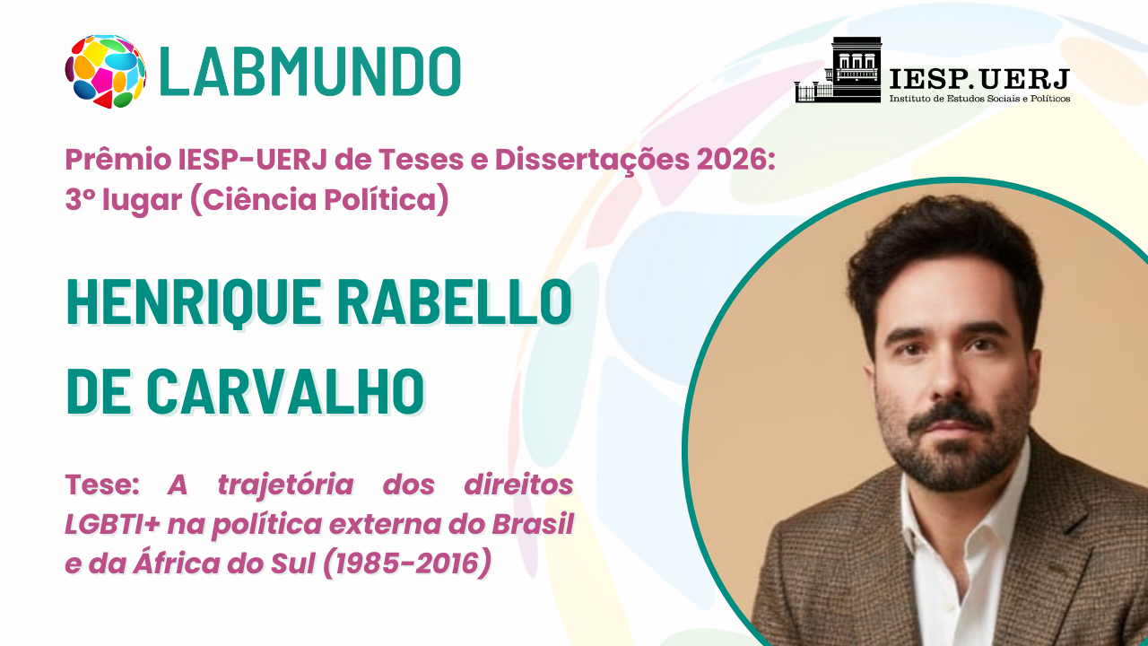 O Instituto de Estudos Sociais e Políticos (IESP-UERJ) publicou a lista de trabalhos vencedores do Prêmio de Teses e Dissertações do IESP-UERJ 2026, e o LABMUNDO, mais uma vez, figura entre os melhores trabalhos acadêmicos defendidos no Instituto durante o ano. A tese de doutorado A trajetória dos direitos LGBTI+ na política externa do Brasil e da África do Sul (1985-2016), defendida pelo labmundano Henrique Rabello de Carvalho e orientada pelo Prof. Carlos R. S. Milani, foi reconhecida com o terceiro lugar na categoria dedicada às teses desenvolvidas no Programa de Pós-Graduação em Ciência Política.